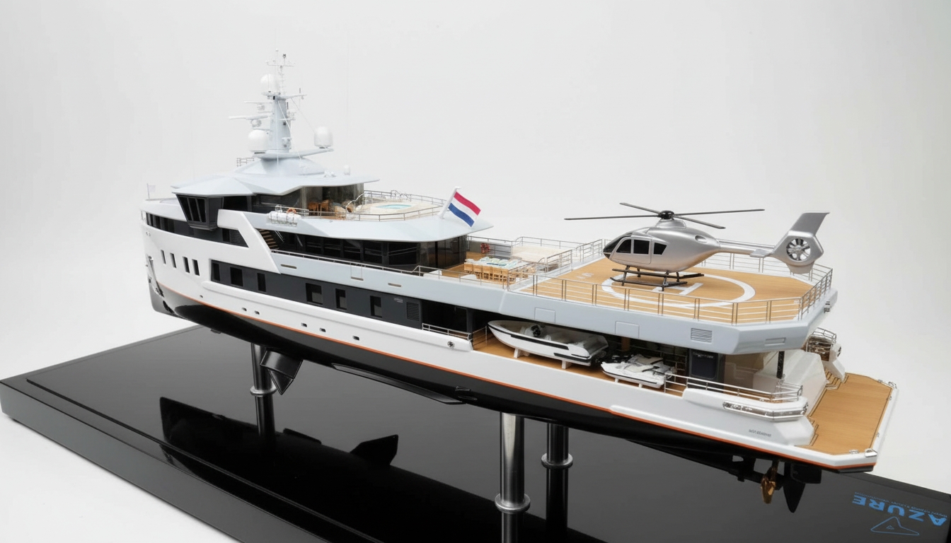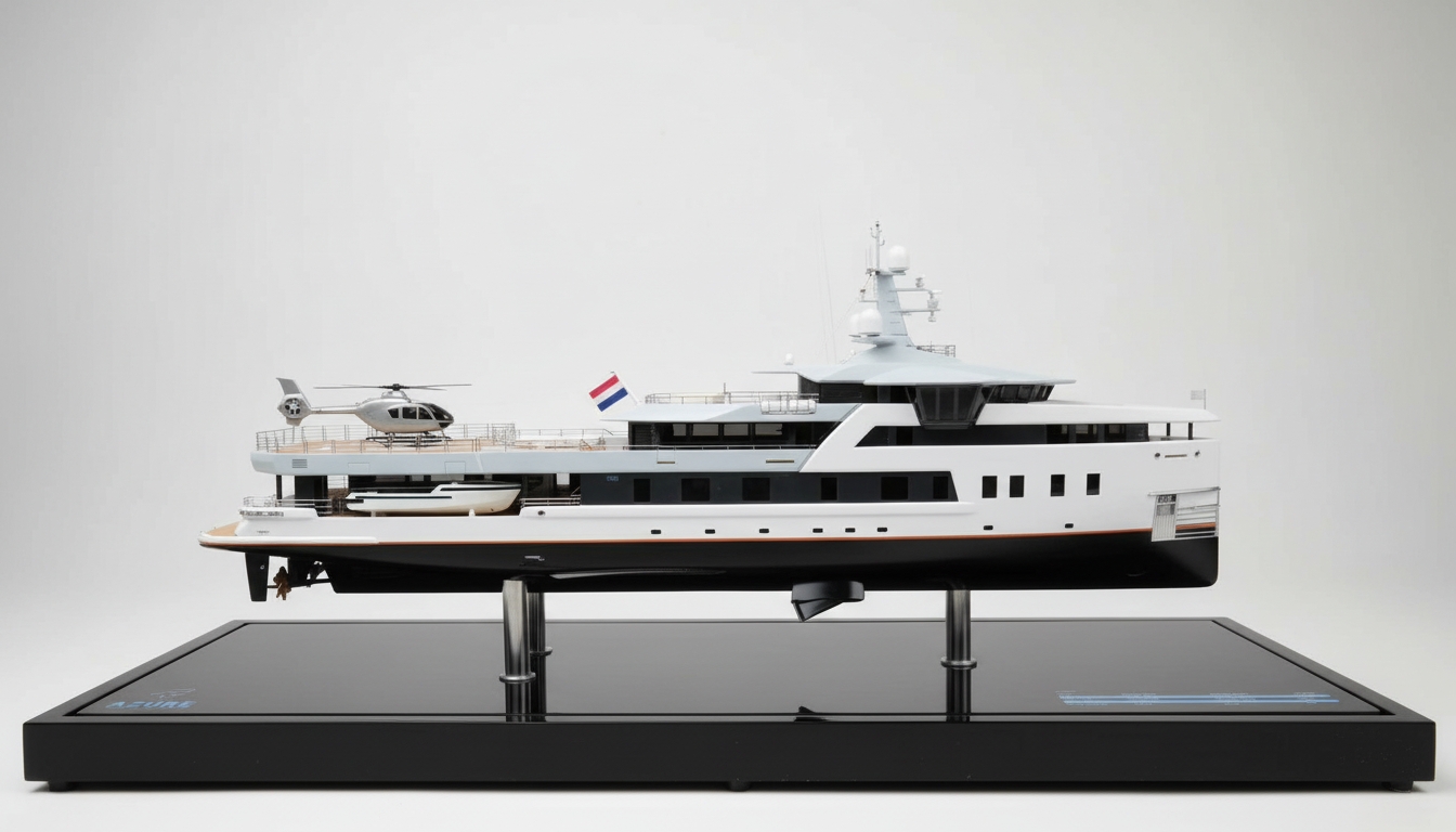 Based on the original CAD and GA data, we translated the design into an accurate, hand-finished scale model with an exceptionally high level of detail. From the powerful hull shape to the refined deck layout, each component has been carefully constructed and finished, presented on a sleek black base plate that matches the high-end character of the yacht.